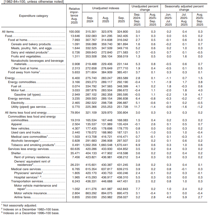 【美國CPI最新數據】2025年9月低於預期,核心通膨降至3個月低點
