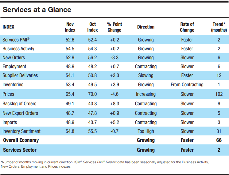 - 11月ISM服務業PMI為52.6,高於市場預期的52.0,顯示整體仍處擴張區間。
