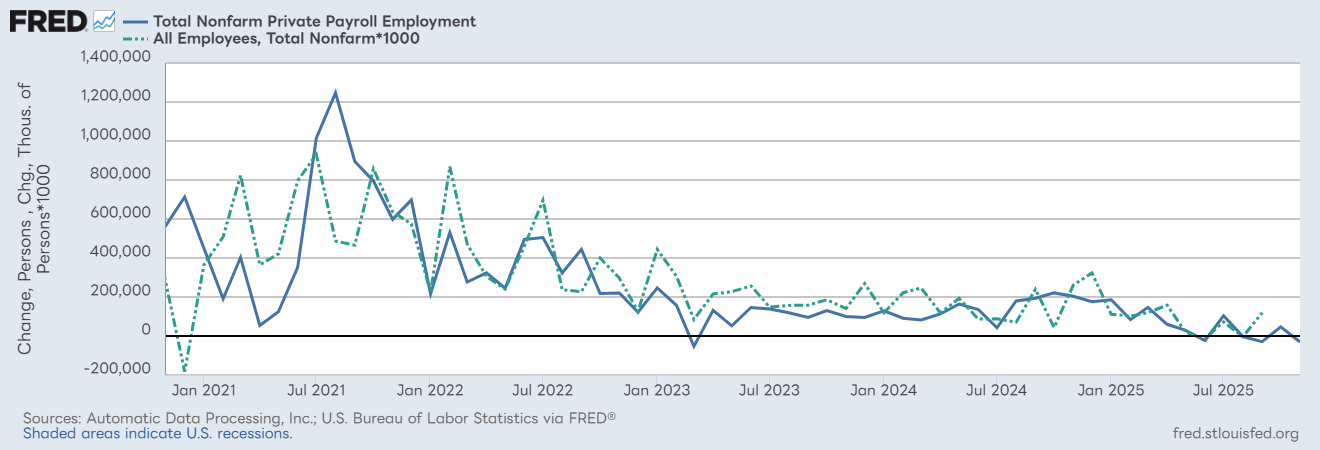 圖三、ADP非農新增就業人口 (小非農,藍) vs 非農新增就業人口(青)