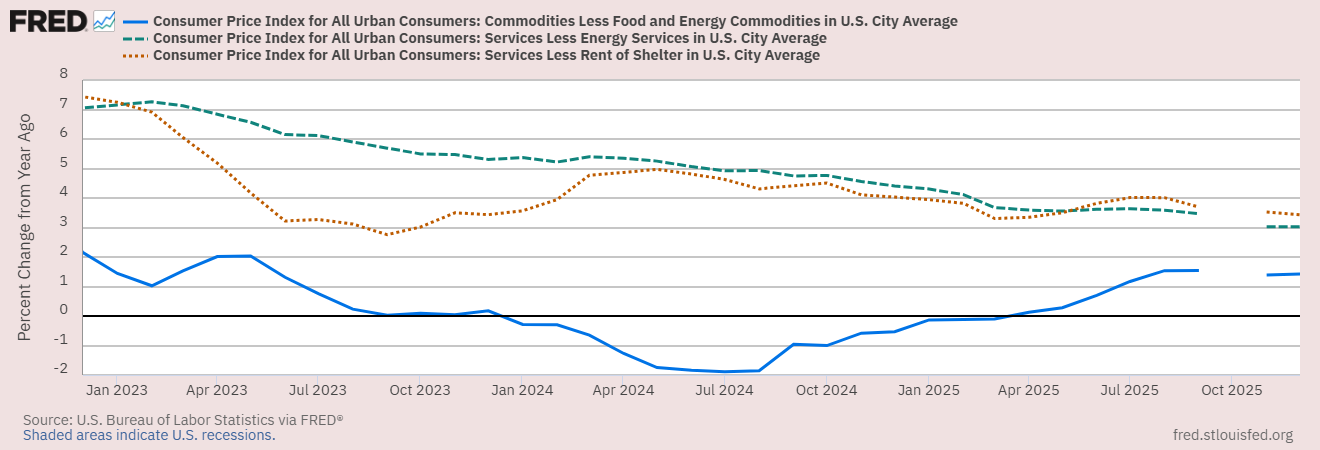 圖三、核心商品(藍)、核心服務(綠)、扣除租金後服務(橘) 通膨年增率;資料來源:聯準會經濟資料庫 (FRED),康和投顧整理